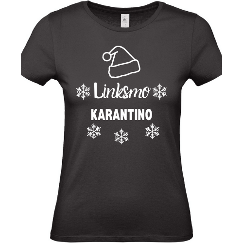 Moteriški Kalėdiniai marškinėliai Linksmo karantino. Puiki dovana artėjančių Kalėdų proga. Galite pasirinkti marškinėlių modelį, spalvą ir užrašo spalvą.